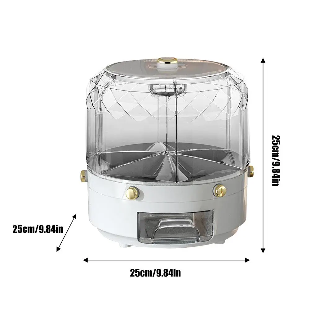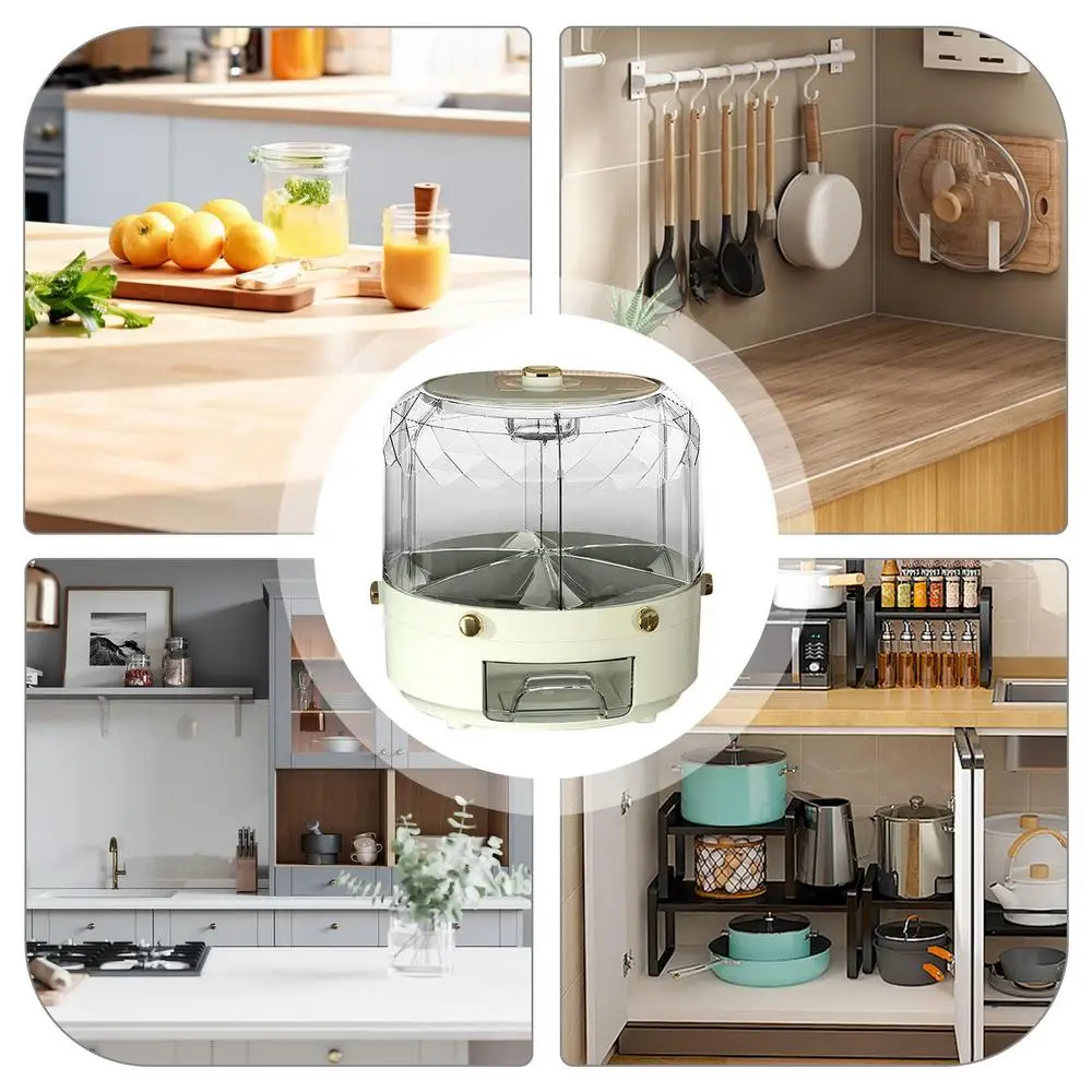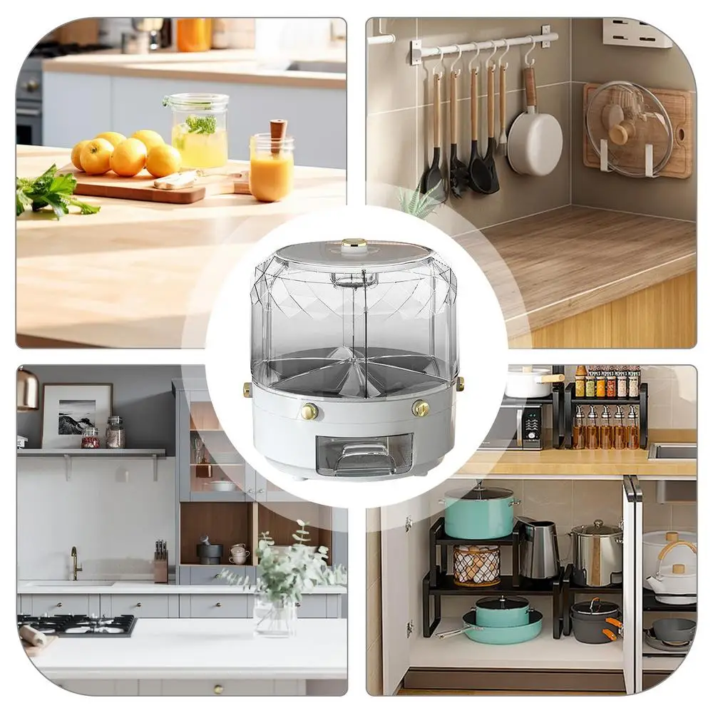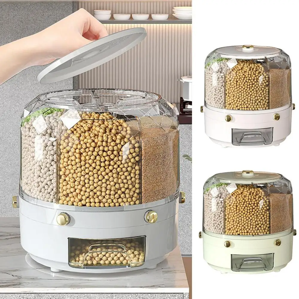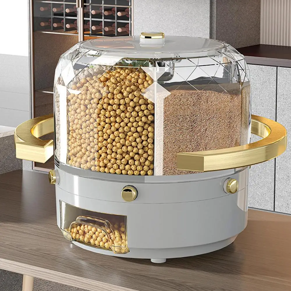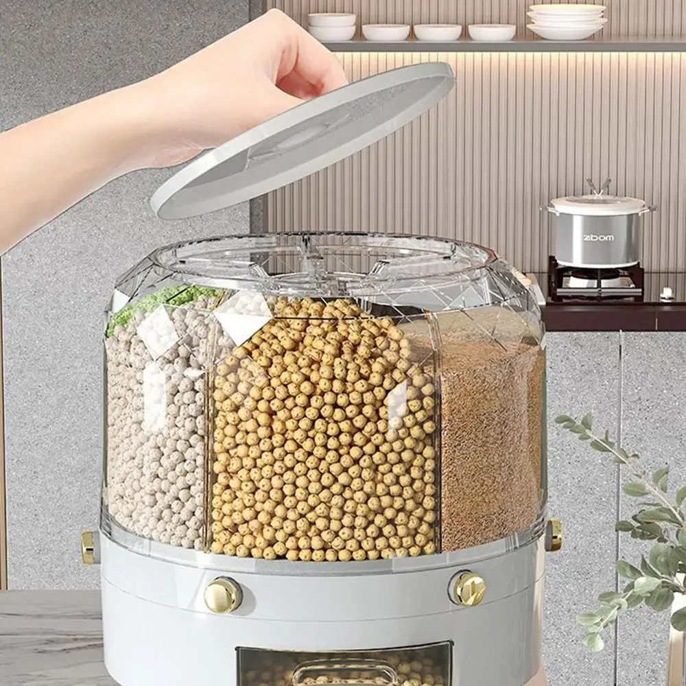 1.Six-Grid Design: The rotating rice dispenser ensures easy access to the desired rice variety while maintaining freshness. Plus, its sorted six-grid design saves storage space and helps control portion sizes