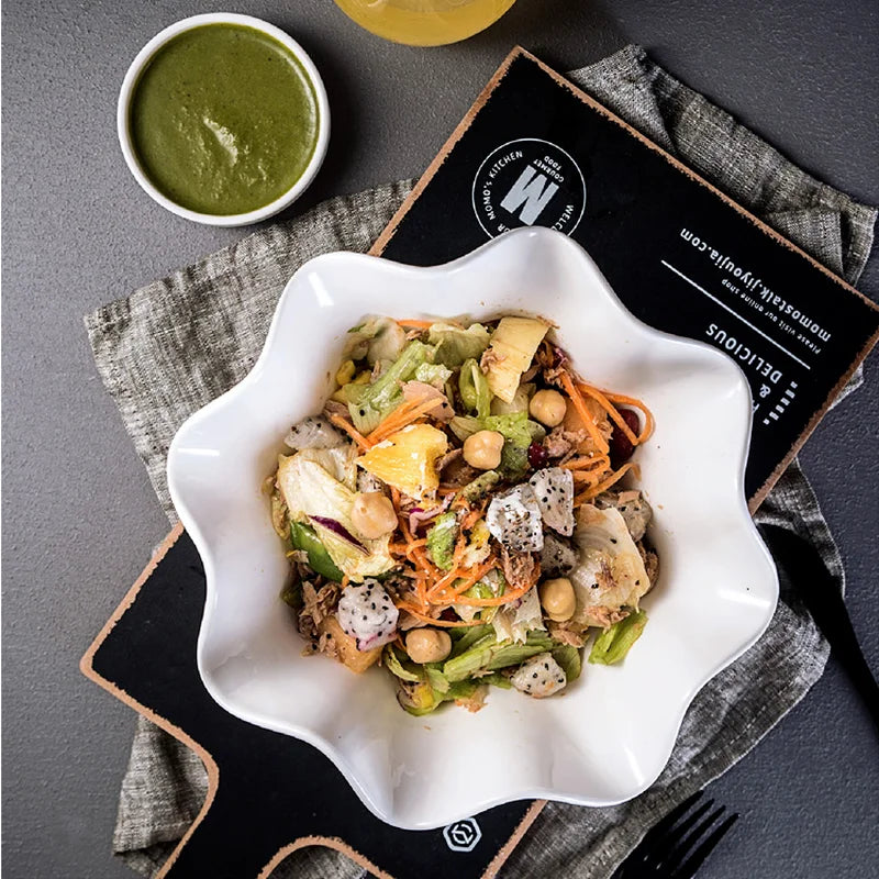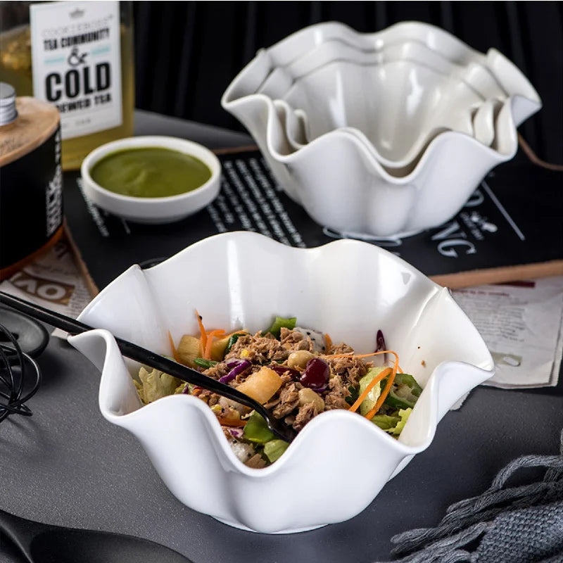 Pure White Ceramic Plate Fruit Salad Bowl Soup Bowls Noodle Bowl Taste Dish Cake Pan Dessert Bowls Crimped Dinner Plate Bakeware.